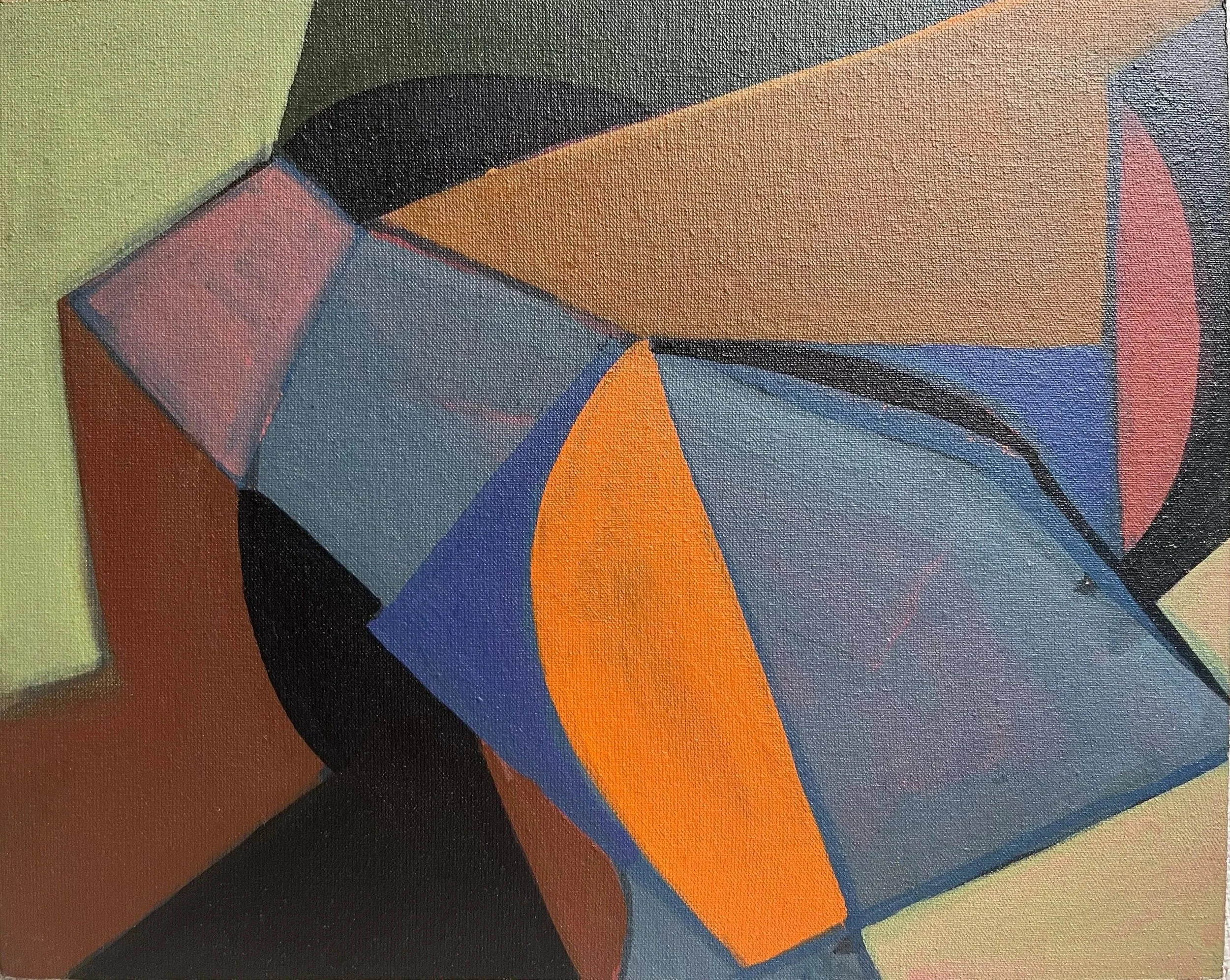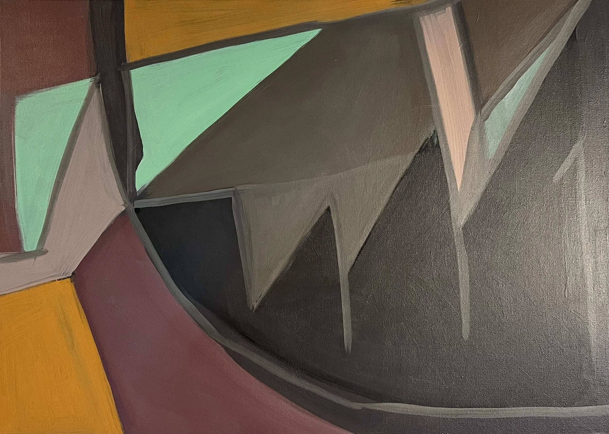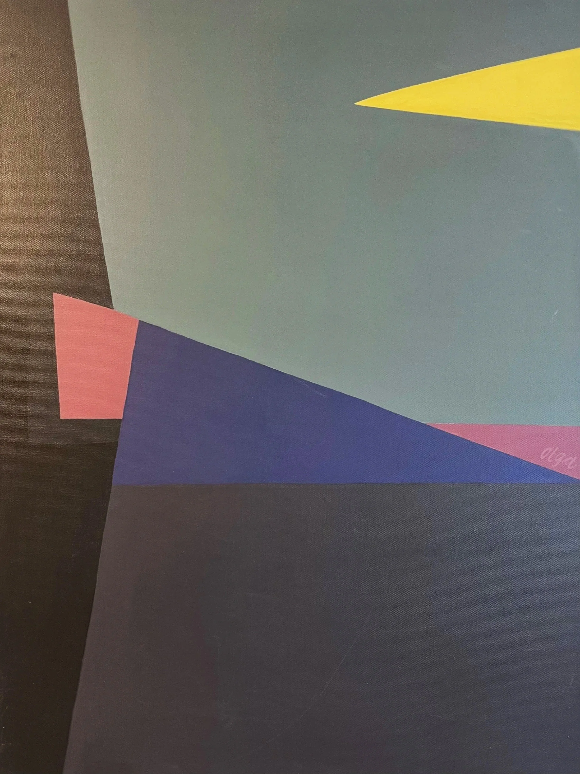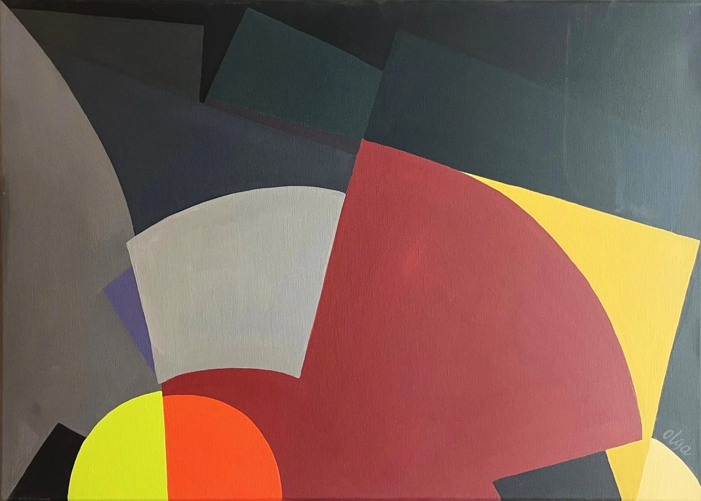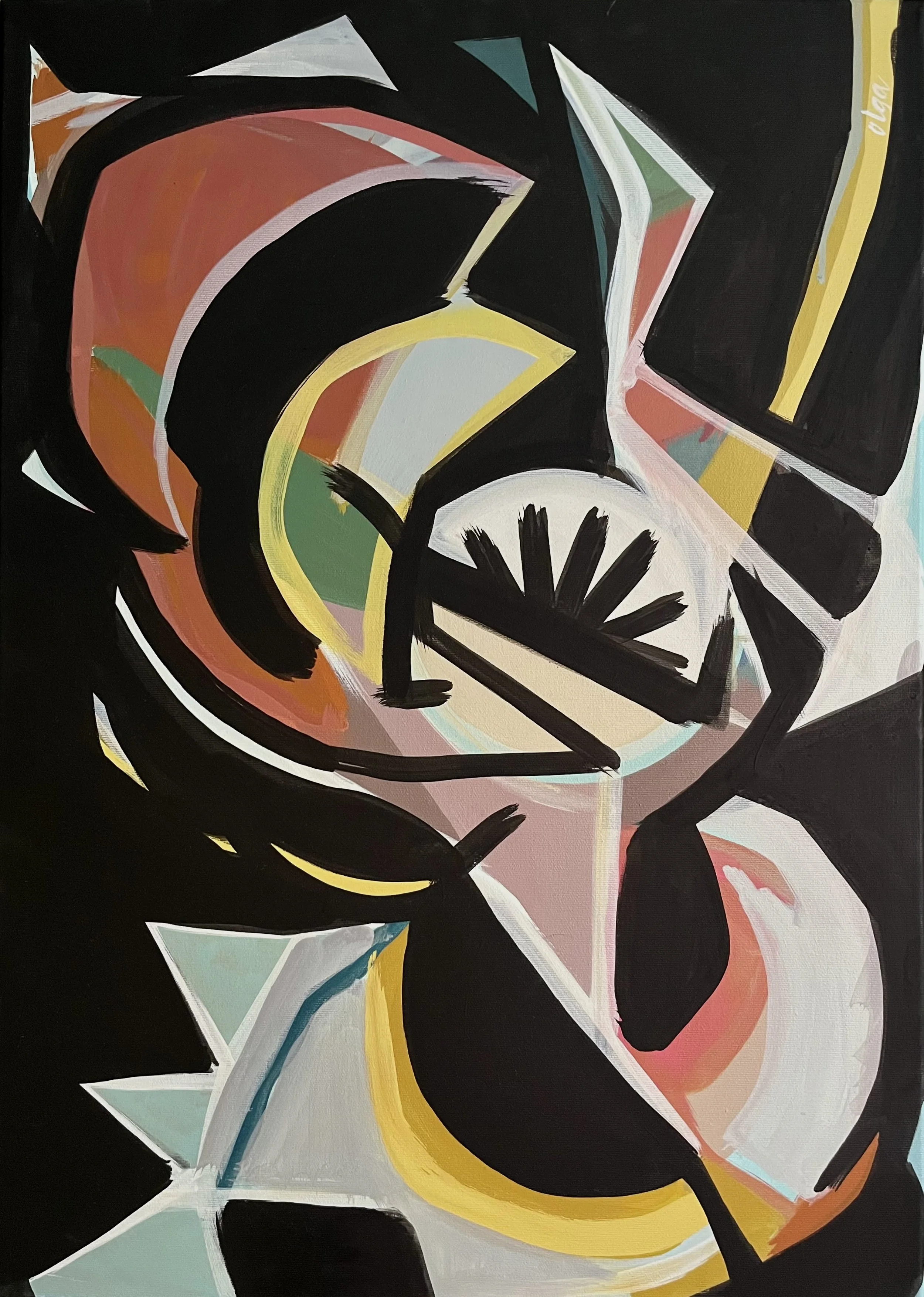 Hier trifft die abstrakte Komposition des Bauhauses auf sphärische Motive und erinnern an die Unendlichkeit des Universums und das Werk von Hilma af Klimt. Runde Formen korrespondieren mit winkligen Flächen, Bewegung entsteht.